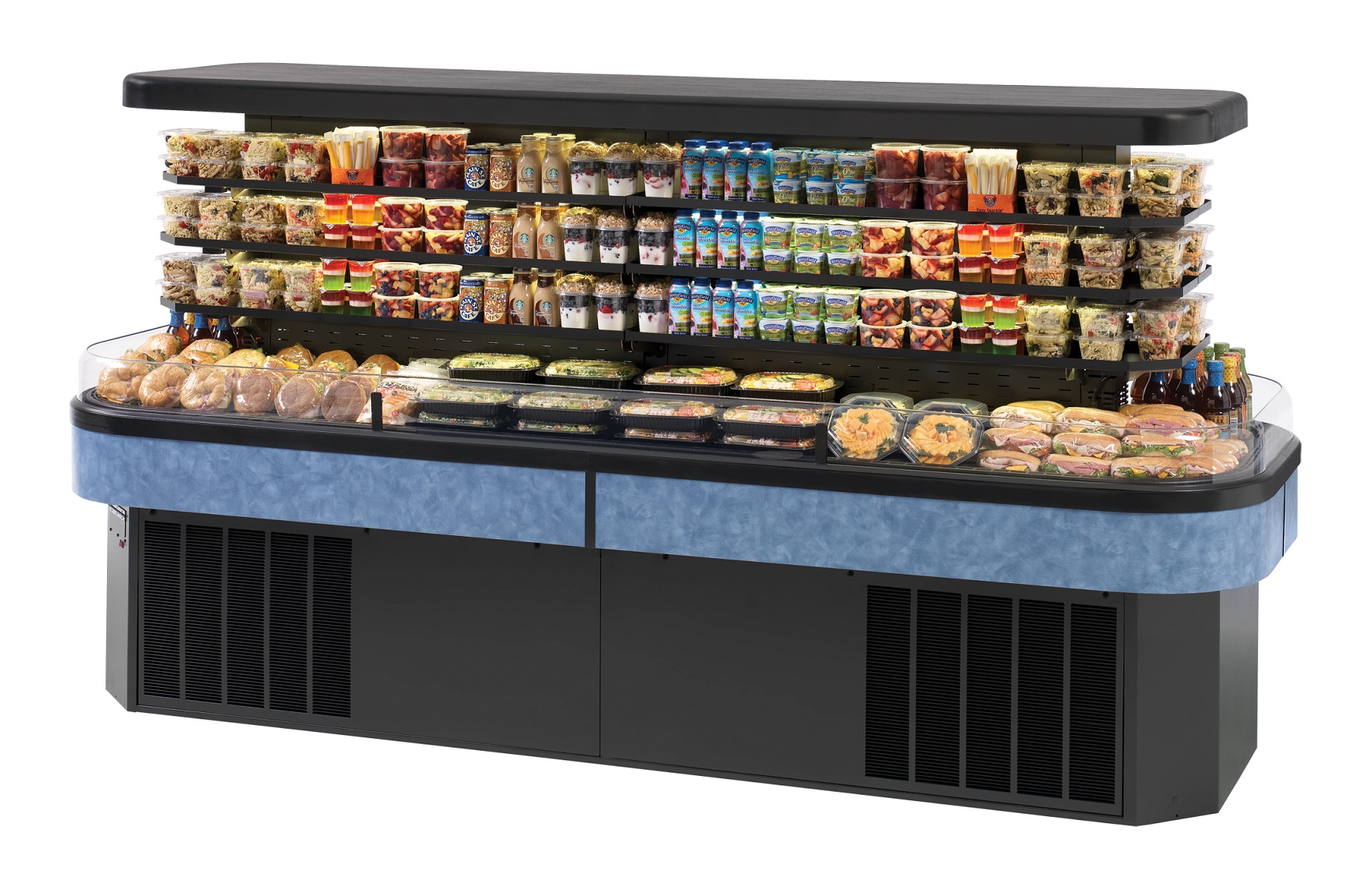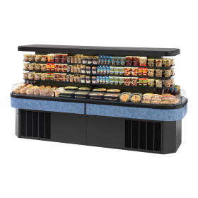 Self contained refrigeration with condensate evaporator, adjustable temperature control LED top and undershelf lighting, two tiers of adjustable black metal shelves, curved air deflector, black metal base, black interior and canopy, choice of laminate, UL safety and UL sanitation approved, 2.5 HP, Condesate Pump Provided