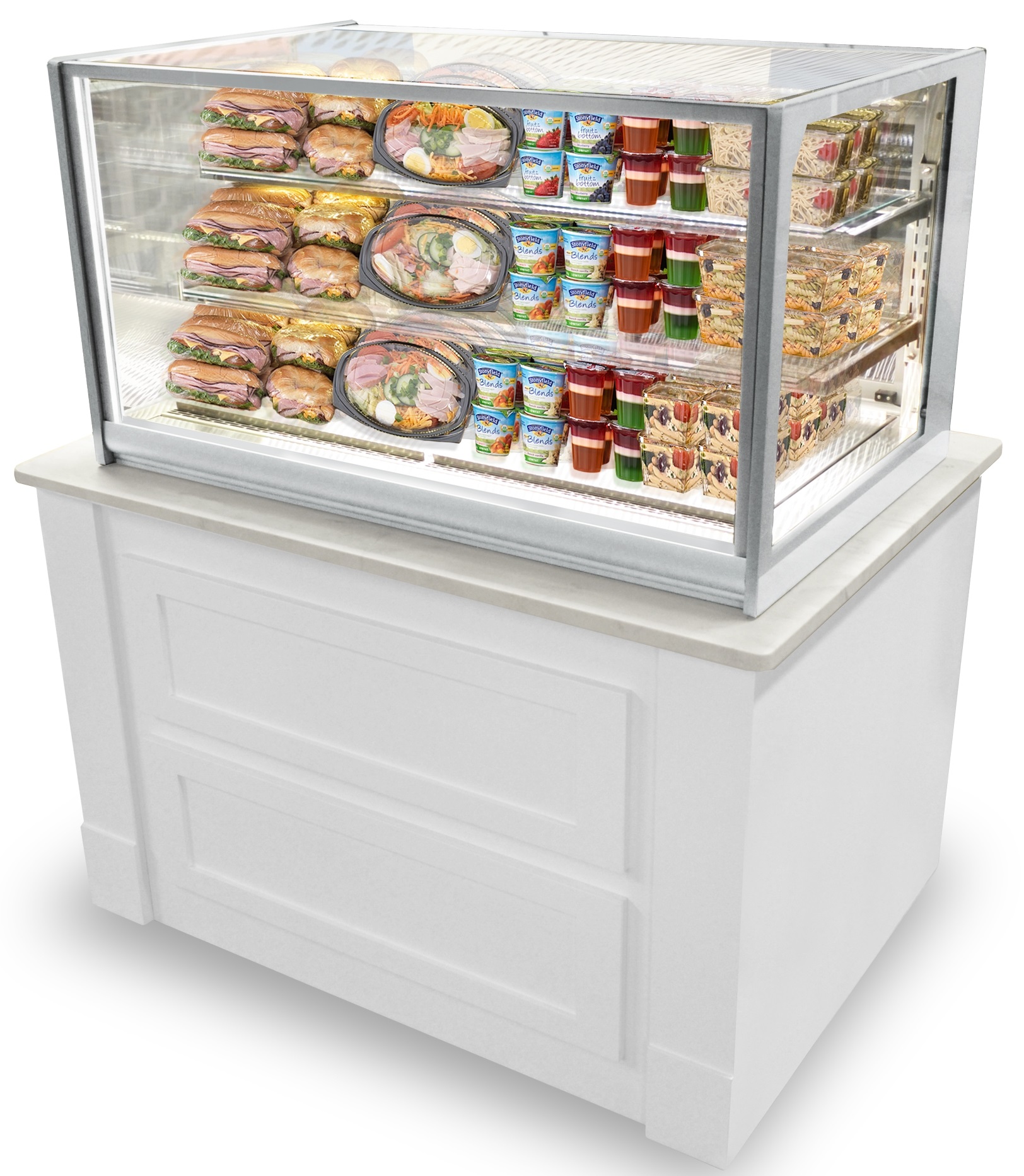 3 Tiers of Adjustable Shelves, Tempered Glass Top, Ends and Doors, Removable Sliding Rear Doors, LED Top Light and Shelf Lights, Steel Base Construction, Choice of six standard Laminates on Base, Rear Air Intake & Discharge, Self Contained Refrigeration with PTC Condensate Evaporator, Adjustable Temperature Control, Stainless Steel Interior, , Leg Levelers, UL, C-UL, and Sanitation Listed for Type I Conditions, Easily Accessible Light Switch, Power Switch, and Electronic Temperature Control, DOE 2017 Compliant,