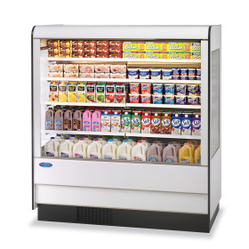 Self contained refrigeration with condensate evaporator, energy saving night curtain, top light, four tiers of adjustable white metal shelves, stainless steel display deck with white interior, tempered glass ends, choice of laminate, designed for continuous lineups, DOE 2012 compliant, UL safety and UL sanitation approved, 1 HP