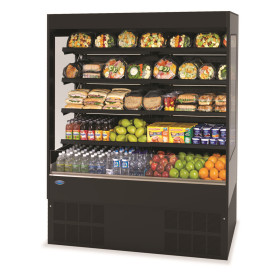 Adjustable black metal shelves with price tag molding. Four tiers of shelves can be flat or slanted. Top mounted fluorescent shielded light. Choice of six standard laminates on exterior. Stainless steel display deck, black interior and glass end panels. Front Air Intake & Discharge. Energy saving night curtain. On-demand PTC condensate evaporator provided for a totally self-contained system. Cord & Plug. UL Safety and UL Sanitation Listed. DOE 2012 Compliant.