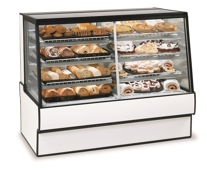 Self contained refrigeration with condensate evaporator, adjustable temperature control, sloped thermopane tilt-front glass, top light and lighted shelves, two tiers of adjustable white wire shelves, glass sliding rear doors, white interior, tempered glass ends, choice of laminate with black trim, designed for continuous lineups, UL safety and UL sanitation approved, 1/3 HP