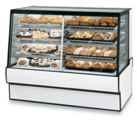 Self contained refrigeration with condensate evaporator, adjustable temperature control, sloped thermopane tilt-front glass, top light and lighted shelves, three tiers of adjustable white wire shelves, glass sliding rear doors, white interior, tempered glass ends, choice of laminate with black trim, designed for continuous lineups, UL safety and UL sanitation approved, 1/3 HP