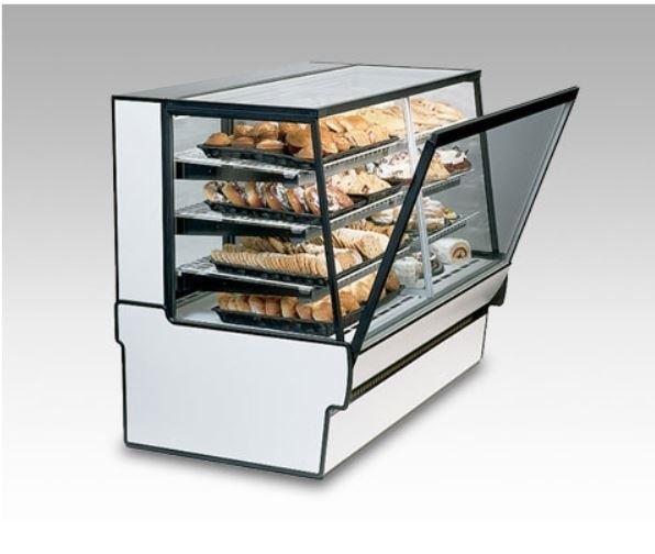 Self contained refrigeration with condensate evaporator, adjustable temperature control, sloped thermopane tilt-front glass, top light and lighted shelf, adjustable stainless steel mezzanine shelf, glass sliding rear doors, white interior, tempered glass ends, removable rear wrapping board, choice of laminate, black trim, designed for continuous lineups, UL safety and UL sanitation approved, 3/4 HP