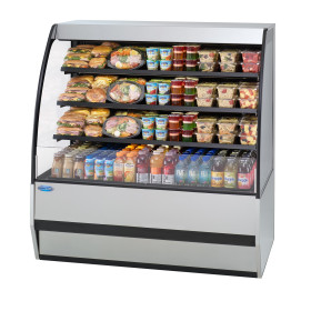 Self contained refrigeration with PTC condensate evaporator, adjustable temperature control, LED horizontal top and shelf lights, three tiers adjustable solid black metal shelves, black display deck and black interior, black trim, tempered glass ends, choice of laminate, designed for continuous lineups, DOE 2012 compliant, UL safety and UL sanitation approved, 1/2 HP