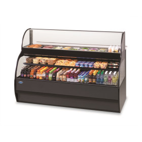 Top Prep Area: stainless steel condiment well that accepts foodservice pans, 10” deep removable work surface, tempered lift-up front glass. Refrigerated Self-Serve Bottom: black exterior, LED top and shelf lights, one solid black shelf tier, black interior with tempered glass ends, energy saving night curtain, ECM fan motors, PTC condensate evaporator, DOE 2012 compliant, UL safety and UL sanitation approved, 1/2 HP