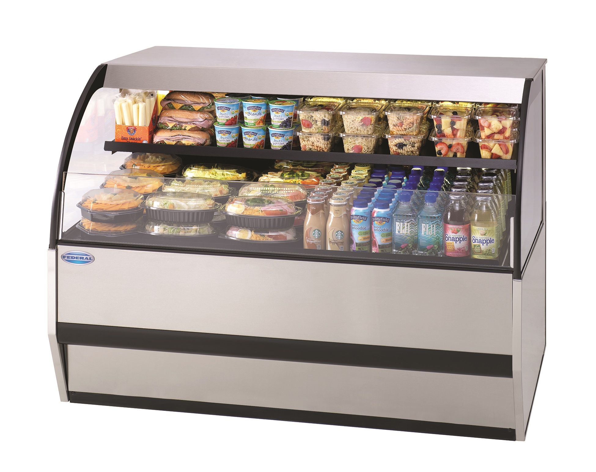 Self contained refrigeration with PTC condensate evaporator, adjustable temperature control, LED horizontal top and shelf light, stainless steel top service area, one tiers adjustable solid black metal shelf, black display deck and black interior, black trim, tempered glass ends, front condensing unit air intake and discharge, choice of laminate, DOE 2012 compliant, UL safety and UL sanitation approved, 1/2 HP