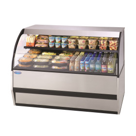 Self contained refrigeration with PTC condensate evaporator, adjustable temperature control, LED horizontal top and shelf lights, stainless steel top service area, two tiers adjustable solid black metal shelves, black display deck and black interior, black trim, tempered glass ends, rear mounted appliance receptical (separate 120V 15A circuit required), choice of laminate, DOE 2012 compliant, UL safety and UL sanitation approved, 1/3 HP