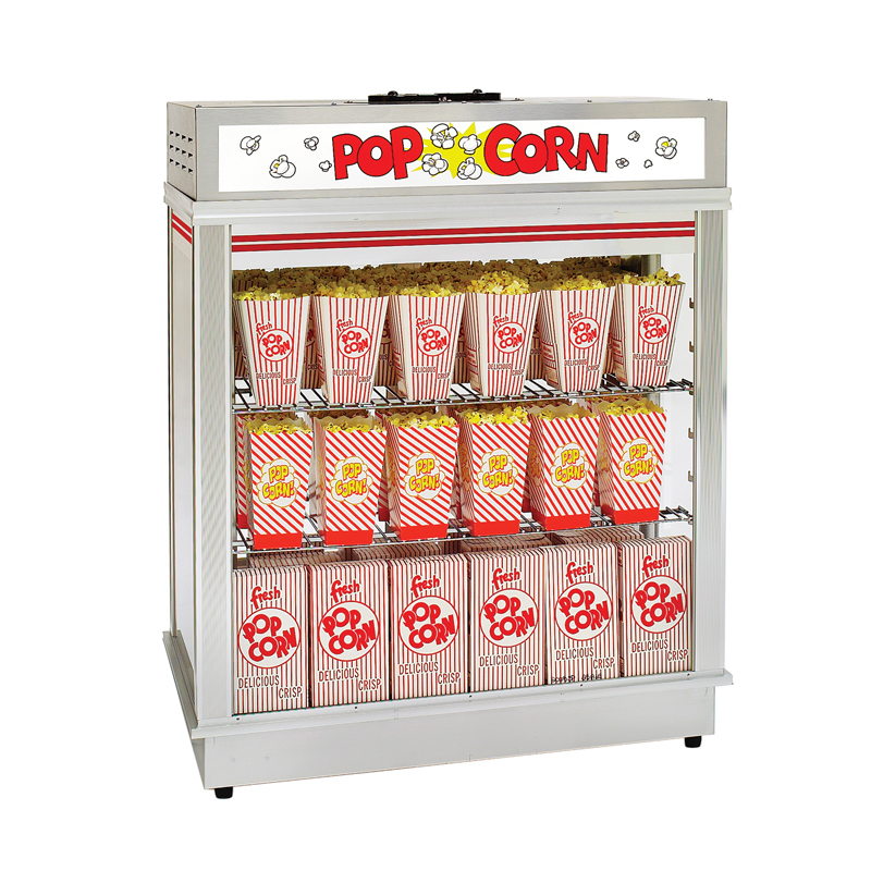 Ideal for busy locations, this three shelf high capacity Astro popcorn warmer features an illuminated sign to help draw in the crowd. It includes sliding doors on both sides for quick and easy loading and unloading of the popcorn. This warmer features the same popcorn freshener system found on the Pop-O-Gold. This high capacity forced hot air popcorn freshener system works quick to keep the popcorn as fresh as possible. It has more space inside then the Astro 16 warmer which allows for more storage of your popcorn.