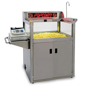 Us this stainless steel movable Serving environments equipped with a rolling base. Also has a serving shelf, heavy-duty casters, transport handle and retractable 15-amp power cord. Choose from an LED sign or no sign, as well as an a drop-down side for loading direct from side-chute popper. Bolt-on side shelf and cash register sold separately.