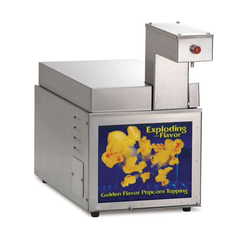 Timing is everything. This small dispenser holds one 19-lb bag of product, but includes a push button that can be used manually or easily set to release topping on a timed cycle. It also features an LED sign, peristaltic pump and flow control.