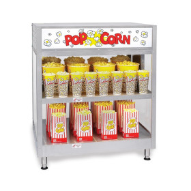 Perfect for busy locations, this two shelf staging was designed exclusively for popcorn, with a reddsigned lower shelf and forced air system. Ability to have lighted sign in either side.