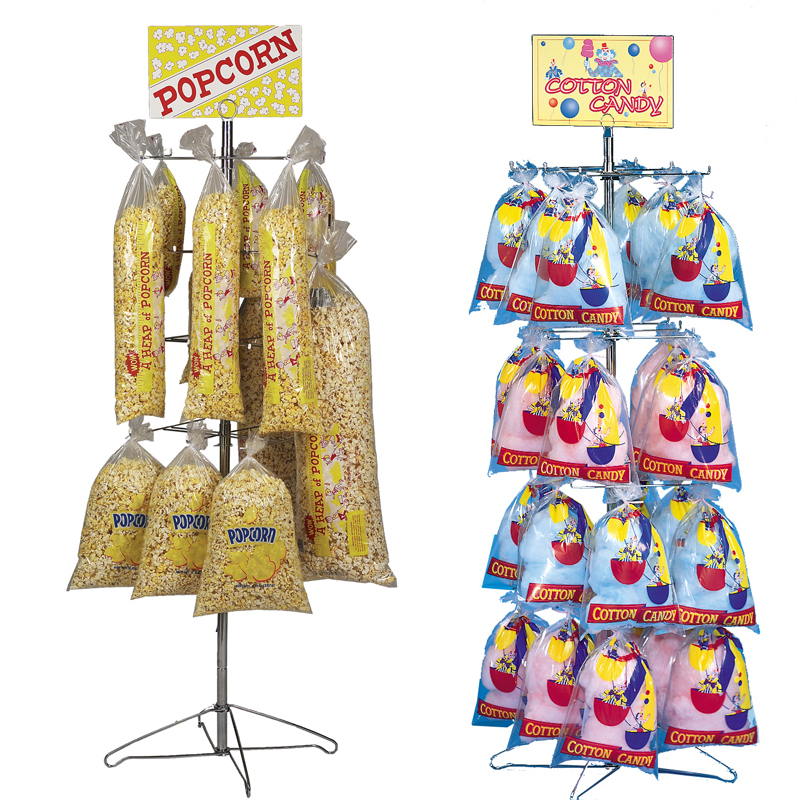 No matter where you operate your popcorn popper, you can generate sizable additional business by packing and displaying at least two "take-home sizes." This will work will work with cotton candy as well. Boost your sales! This Gold Medal Counter Model Floss Display Tree holds 32 bags of scrumptious cotton candy! A long-time favorite with adults and kids, having this handy display stand right on your counter is guaranteed to increase sales! Stands 4" high. Gold Medal Kwik Lock closures have a hole so that you can quickly and easily hang the bags on the display tree. Sign not included. Some assembly required. Picture shown is the floor model.
