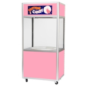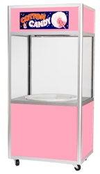 Maximize your profits with this designer cabinet featuring rounded corner posts and pink theme construction. The animated cotton candy sign is lit as well as the interior to show off your product. Casters lock into this place when in use.