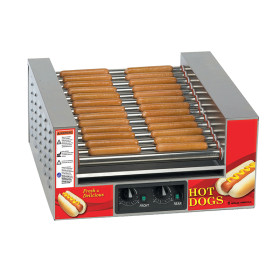 All 14 rollers are available slanted only for operator convenience. Roller length allows for two of the large quarter pound gourmet hot dogs in each of the thirteen positions. When you only have 21" of counter space and want to sell up to 50 sales per hour chose this "money machine!" 30 minute cook cycle from frozen, 20 from room temperature.