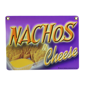 The bright colors and eye-catching graphics of this 16" x 12" Gold Medal 5899 "Nachos, Cheese" sign will capture potential customers' attention and bring them right to your concession stand, snack bar, or convenience store for delicious nachos! It hangs easily from your window or on the wall.