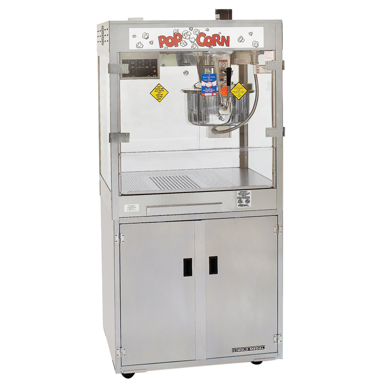 The Odyssey is a 32 ounce theater sized popcorn machine that features an EZ Kleen kettle, Big Eye electronic heat control, Bag-In-Box oil system, stainless steel cabinet, forced air popcorn crisping system and an airtight bin holding popcorn. The E-Z Kleen kettle is polished stainless steel on the inside and outside which allows for hassle-free cleaning and better batches of popcorn every time. The "Big Eye" Electronic Heat Control signals the operater when the popcorn is ready to be dumped. Included Stainless Steel floor base.
