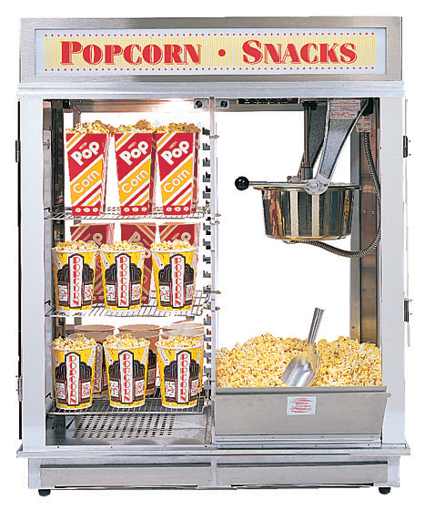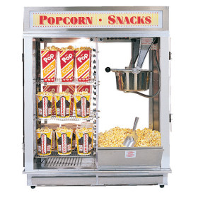 This combination Popcorn machine and warmer from Astro 16 is extremely user-friendly. "Bottom Line" oriented is what the Pop and Self-Serve Combo 16 oz. kettle popcorn machine really is. This machine uses the very successful Astro 16 kettle and it's 36" (91cm) wide cabinet is divided in half. The 3 adjustable shelfs have a total of 24" to work with. The reversible illuminated sign helps attract attention to this great self serve popcorn machine. A single self-closing door on the customer side allows people to serve themselves and be shielded completely from the hot kettle. The illuminated dome is reversible. This machine also has a bottom heater/blower unit to keep you popcorn warm.