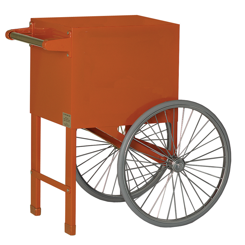 This popcorn cart will make your popcorn machine easier to use, raising it to just the right operating height. It also looks great, completing the classic popcorn machine look while the handle and spoke wheels make it easy to move and transport the cart. This popcorn cart is built to the same rugged standards as all of our carts and wagons, made of durable stainless steel. This cart is also available without the white screen print and in a wide variety of other colors.