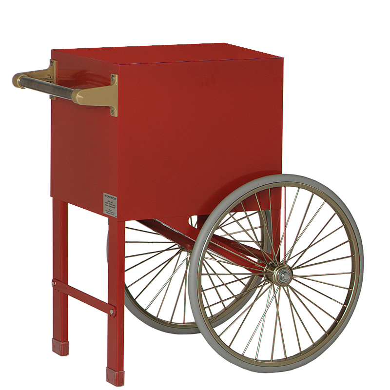 This popcorn cart will make your popcorn machine easier to use, raising it to just the right operating height. It also looks great, completing the classic popcorn machine look while the handle and spoke wheels make it easy to move and transport the cart. This popcorn cart is built to the same rugged standards as all of our carts and wagons, made of durable stainless steel. This cart is also available with gold screen print and in a wide variety of other colors.