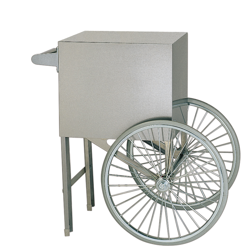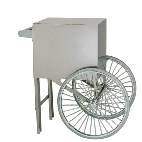 This popcorn cart will make your popcorn machine easier to use, raising it to just the right operating height. It also looks great, completing the classic popcorn machine look while the handle and spoke wheels make it easy to move and transport the cart. This popcorn cart is built to the same rugged standards as all of our carts and wagons, made of durable stainless steel. This cart has a rear door. This cart is also available without the white screen print and in a wide variety of other colors.