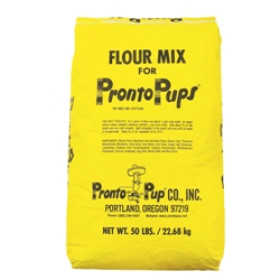 Pronto Pup Corn Dog Mix, 50 lb. bag. There is a certain group who prefers this mix. It s a little less sweet. Naturally, 50 lbs. is not a great deal of product if you are running a busy Corn Dog operation. It s not uncommon for a high volume operator to use over 200 lbs. of mix per week. The approx. yield is 400-450 hotdogs per case. Yields vary depending on the size of the hotdog. Ingredients Statement: Wheat flour, bleached and enriched (flour, niacin, iron, thiamine, mononitrate, riboflavin), corn meal, corn flour, sugar, salt, dextrose, leavenings (sodium acid pyrophosphate, sodium bicarbonate, monocalcium phosphate, calcium suphate), egg yolk, nonfat milk, and rice flour.