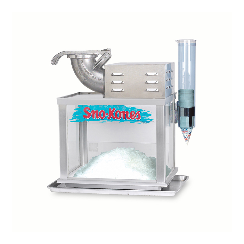 The Sno-Konette was the world's first complete ice shaver with display case. It began its life back in 1947 and has been improved dozens of times resulting in the great product we have today. This sno-kone machine features a 1/3 HP, 1725 RPM high-speed shaver mounted on extended aluminum cabinet with tempered glass windows. To operate simply lift the pusher handle, fill with chunks of ice, turn on the motor and pull the handle. You can vary the fineness of the finished snow by using colder ice, putting less pressure, or adjusting the blade. The Sno-Konette is still the world's leading ice shaver, and with the profits in Sno-Kones, this machine will quickly pay for itself.