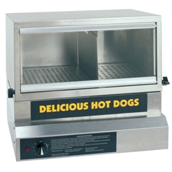 This large and powerful hot dog cooker can perfectly steam up to 75 hot dogs at a time for maximum hot dog production in a short amount of time. Additionally, it is designed with separate water and cooking chambers, making it incredibly easy to keep the entire steamer clean, and it features easy-to-use manual temperature controls with infinite temperature adjustment for precise cooking results. Features: Infinite heat control, Attractive glass door, Heavy-duty construction. Benefits: Adjustable steam baffles allow you to regulate heat more effectively, Separate water pan and cooking chamber makes cleaning and maintenance a breeze, Gets hot dogs to the proper serving temperature in a minimum amount of time for fast operation