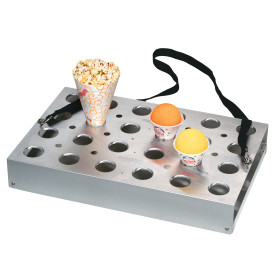 This "3 Way" 24 Hole Vending Tray is packed with strap, handle and aluminum drip/drain tray. Some assembly required. You put on the handle or strap -- whichever your hawkers prefer.