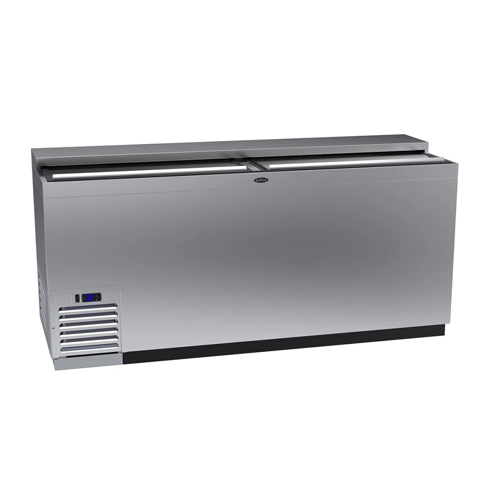 This Krowne BC72-SS bottle cooler has a self-contained, built-in refrigeration system that's simple to set up and access. Because it comes equipped with a condensate evaporator pan, the cooler doesn't need a costly drain line installation. This unit measures 72 inches wide by 24 inches deep by 34 inches high and is built with two sliding top doors featuring rugged grab bars. While the interior, front, and sides are made of 20-gauge stainless steel, the rear is 20-gauge galvanized steel; both metals are durable enough to endure high-volume use in fast-paced kitchens and bars. To simplify cleaning, the interior is built with coved corners.