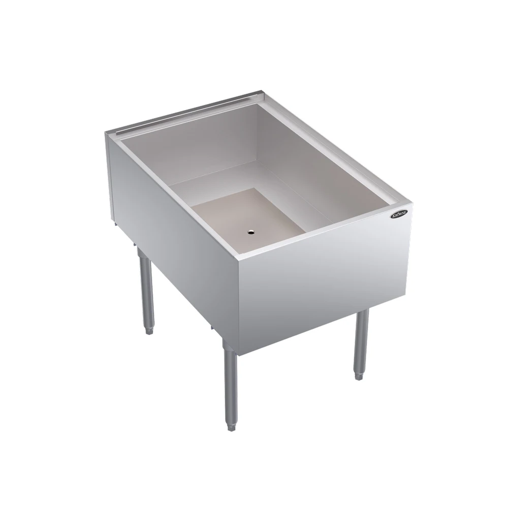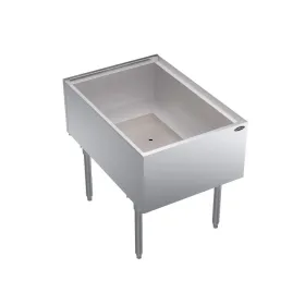 The Krowne KRPT-1836 Silver ice bin stores ice for beverage service while helping maintain cold temperatures with an insulated stainless steel interior. A full sliding cover protects the ice supply between uses while keeping it accessible during drink preparation. The unit includes a 3-inch backsplash that helps shield surrounding surfaces from splashes. A 1-inch drain removes melted ice water, and stainless steel construction with 1 5⁄8-inch tubular legs and gray plastic bullet feet supports placement in bar workstations.