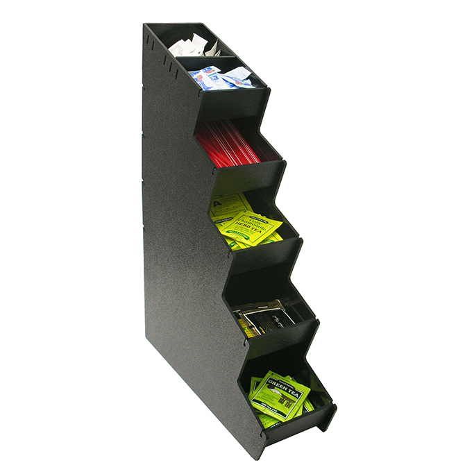 This organization station is packed with features. At only 4.5" wide it will fit into the narrowest of spaces, yet it organizes five large sections of condiments. The sloped shelves can be rear loaded to assure freshness and rotation of products. It is built of high impact plastics that make it virtually indestructible, assuring you years of service. The top shelf has movable dividers to add up to 5 compartments.