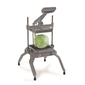 Cut mounds of crisp, fresh lettuce in seconds. Process a whole head of cored lettuce at a time. Scalloped blades and clean slicing action cut one-inch squares with no crushing and no bruising. Interlocked blades avoid flexing. Replaceable blades for long life; no tensioning required. Cleanup is easy. Just pull one pin to remove pusher block. Clip-on blade assembly lifts out easily. Angled, cast aluminum legs with no-slip feet provide stable cutting platform. Manual locking pin keeps pusher block safely in place until operator releases for cutting. Slicing blade assembly also available, 55650-CS can be used to slice cooked chicken for wrap sandwiches and salads.