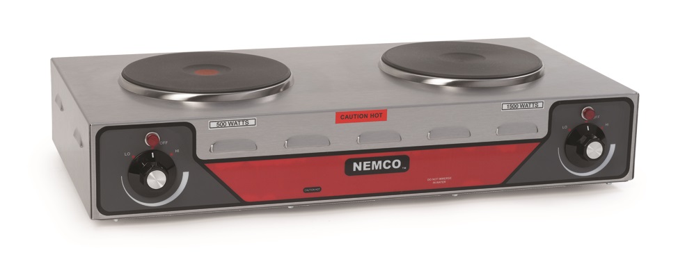 Powerful NEMCO burners make an attractive choice for demonstration cooking. Solid-top, cast-iron French burners heat up quickly and evenly, with six heat settings that can take you from a simmer to a boil in minutes. Horizontal and vertical configurations with one-, two- and four-burner setups fit most spaces. Multiple burners offer heating versatility. Right burner on the horizontal is a 1500-watt cooker, while the 500-watt left burner is perfect for warming. Vertical units have the cooker in the front. Durable, stainless steel construction makes cleanup quick and easy. All models equipped with adjustable feet for added convenience.