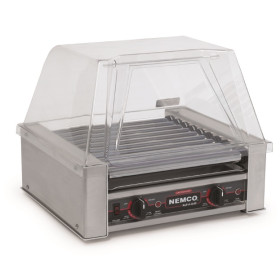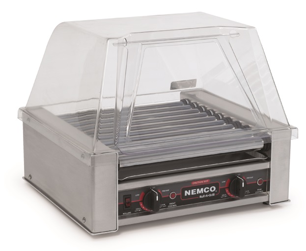 Let profits roll! Everybody loves a NEMCO Roller Grill hot dog. Plus, these surprisingly versatile machines are also great for such ethnic favorites as egg rolls and tamales. The 360° roller rotation prevents residue buildup, while individual roller heating elements ensure heating consistency. Removable drip pan makes for easy cleaning. Electric power requires no ventilation system. Seven heat settings offer convenient temperature control. For optimum roller performance capability, look for GripsIt models that include SilverStone with grip-and abrasion-resistant additive.