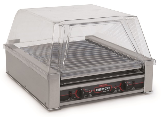 Let profits roll! Everybody loves a NEMCO Roller Grill hot dog. Plus, these surprisingly versatile machines are also great for such ethnic favorites as egg rolls and tamales. The 360° roller rotation prevents residue buildup, while individual roller heating elements ensure heating consistency. Removable drip pan makes for easy cleaning. Electric power requires no ventilation system. Seven heat settings offer convenient temperature control. For optimum roller performance capability, look for GripsIt models that include SilverStone with grip-and abrasion-resistant additive.