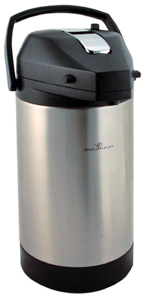 The ShurizJo vacuum insulated stainless steel coffee airpot keeps beverages hot for 6 hours. The durable high impact polycarbonate plastic\stainless steel exterior and stainless steel interior liner provides a virtually indestructible thermal system. The brew through lid allows for maximum heat retention during brewing and serving. The carrying handle allows for total coffee mobility, the travel lock eliminates spills on the move and the reinforced pivot handle swings either front or back.