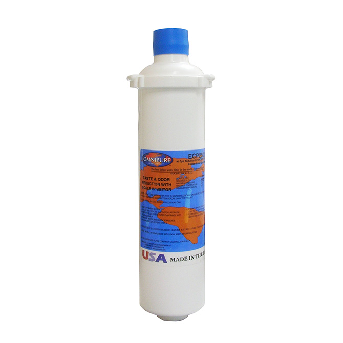 The Omnipure ECP2501 water filter is a 1 micron carbon block that protects against Cyst, taste, odor, and Chlorine Reduction With Scale Inhibitor Filters.