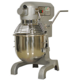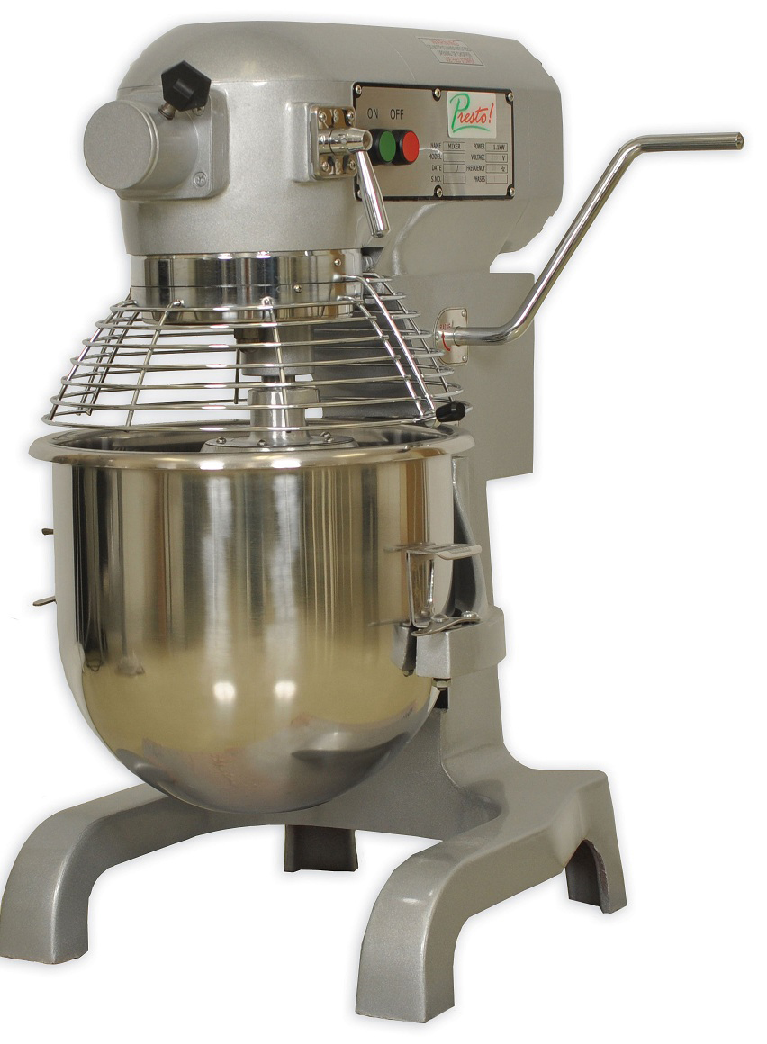 Primo PM-20 food mixer has a 20 qt. stainless steel bowl, a 1.0 horsepower three-speed electric motor with a gear-driven transmission for durability and reliability, and a stainless steel wire bowl guard for safety, and it is suitable for mixing and whipping ingredients, kneading dough, and other food preparation. Standard accessories that come with the mixer include a stainless steel wire whip for souffles, meringues, cream, and other mixtures that require aeration, an aluminum flat beater for mixing or beating batters and other mixtures, and an aluminum dough hook for mixing and kneading dough. The motor's transmission is sealed and self-lubricating for durability, and the transmission gears and shaft are made of heat-treated hardened alloy steel for durability and strength. The controls for the mixer are mounted on the side and include a separate start button and emergency stop button for safety. The mixer has a safety interlock switch that prevents the motor from running if the bowl is lowered or if the bowl guard is open. The mixer comes with a six-foot cord with a plug, and it operates on a standard 120/60/1 power source, which is available in most homes and businesses. The mixer measures 30-1/2 x 16-1/2 x 21 inches (H x W x D). (H is height, the vertical distance from lowest to highest point; W is width, the horizontal distance from left to right; D is depth, the horizontal distance from front to back.) No assembly is required.