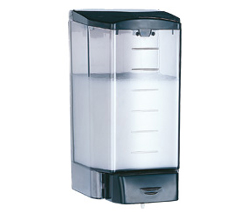 Wall mounted soap dispenser, robust and vandal-resistant with a body, top-filling lid and push-button made of stainless steel AISI 304, 22-gauge (0.8 mm), white epoxy coated. It shall be mounted on the wall by means of 4 wood screws with their corresponding 3/16" (5 mm) wall plugs; the lower ones attach the dispenser, while the upper ones fix it to the wall. The dispenser shall include an anti-dripping and anti-corrosion valve, which is based on a polyamide piston with 2 elastomeric toroidal gaskets, silicone blocking pivot and stainless steel ball to ensure tightness. The thermoplastic container shall be 1/8" (3 mm) thick and the access to its interior shall be using a standard saniflow key supplied. The dispenser shall be provided with stainless steel AISI 302 springs and housing with 1 viewing slot. The soap dispenser shall be suitable for commercially marketed all purpose liquid and lotion hand soaps and synthetic detergents except for E4-rated antibacterial soaps (active ingredients PCMX or Triclosan), iodine-based surgical soaps, or alcohol-based antiseptic solutions. Overall dimensions shall be 4-5/8"W x 8-1/8"H x 4-5/8"D.