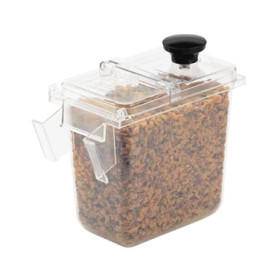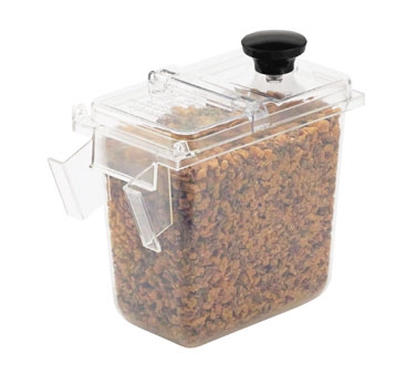 Rear tabs allow a hinged lid to be attached. Side slots accept a strike bar for leveling portions with a spoon or scoop.
