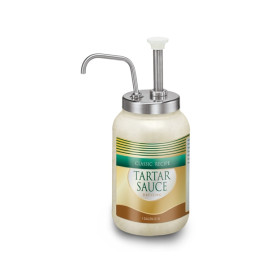 This stainless steel condiment pump is ideal for dispensing just about any condiment or dressing, including those with larger chunks such as tartar sauce and Thousand Island dressing directly from a plastic or glass gallon (3.8 L) jar with a 110mm opening. Black lid is constructed of polycarbonate.