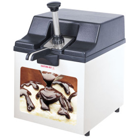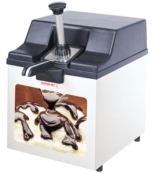 Advantage™ models are constructed of stainless steel with a black, high-temperature plastic top. The pump is stainless steel as well. The beauty of this unit lies in its capacity. This closed, sanitary system allows you to dispense from one heated pouch while warming a second in reserve • eliminating down time when switching out the empty pouch and waiting for it to warm up. The magnetic hot fudge topping sign helps merchandise your toppings.