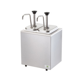 This insulated bar combo features stainless steel pumps that can dispense thick products with particulates, which typically require chilling. This model includes two stainless steel pumps 83330 and deep plastic fountain jars 82557. The brushed finish base reduces the visibility of fingerprints and may be cooled with one Eutectic Ice Pack per jar, HOLDCOLD Jars or ice. Ice packs and HOLDCOLD jars are sold separately