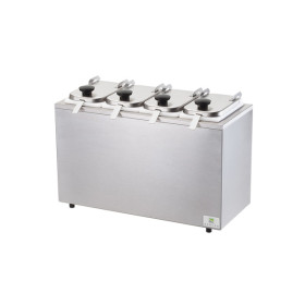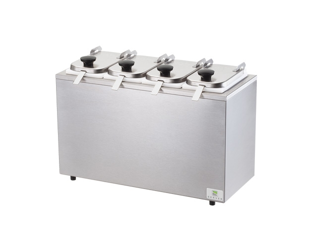 This insulated bar combo includes (4) shallow plastic jars 82558, stainless steel hinged lids 82545 and 1 oz (30 mL) ladles 82562. The brushed finish base reduces the visibility of fingerprints and may be cooled with (2) Eutectic Ice Packs or ice. Ice packs are sold separately. When you place your order, be sure to request colored knobs engraved with your contents for a clean presentation. Black knobs are standard.