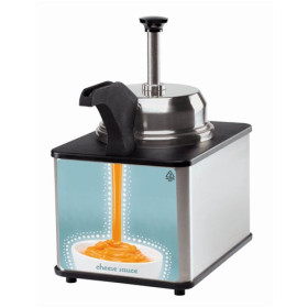 This model has a pump and spout warmer that dispenses opposite instrument panel side from a #10 can or 3 quart (2.8 L) stainless steel jar 94009 (not included). A 1 ounce (30 mL) serving is the maximum portion which can be reduced in ¼ ounce (7 mL) increments, using the supplied gauging collars.