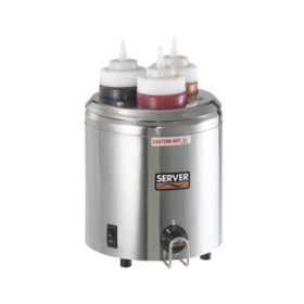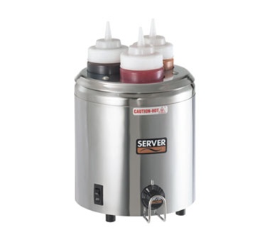The warmer is thermostatically controlled to hold products at serving temperature in a dry vessel. Topping warmer and squeeze bottle holder are constructed of stainless steel for durability and long life. Server warmers feature a thermostat that senses food temperature and turns the heating element on or off as needed to eliminate burning or scorching.