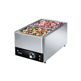 This full-size pan warmer is all stainless steel, including the water vessel. It features an adjustable real thermostat with degree markings and a water bath design. The adjustable thermostat actually senses food temperature and turns the heating element to on or off to keep your product at the perfect temperature. The FS-20SS is end operated for adjustment ease when lining up more than one warmer.