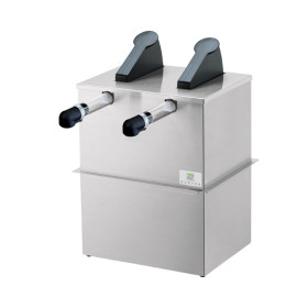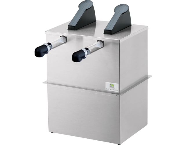 The Server Express Twin system dispenses exclusively from (2) 1⅓ gallon (or 6 L) Cryovac pouches with 16 mm fitments. It features surgical-quality plastic pumps that are quick to break down, dishwasher safe and achieve up to 98% evacuation. The stainless steel shroud with lid is designed for countertop use.
