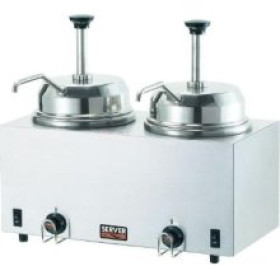 FSP Twin Fudge Server with Pumps Pumps directly from #10 cans. Pumps yield 1 oz (29.6 mL) max. Collars provided to reduce yield. Adjustable thermostats with degree markings on knobs. Knob guards help protect thermostats. Water fill lines eliminate overflow accidents. Portion control pumps offer 1, 3/4, 1/2 and 1/4-ounce servings. All stainless steel construction for durability.