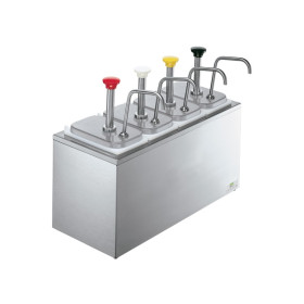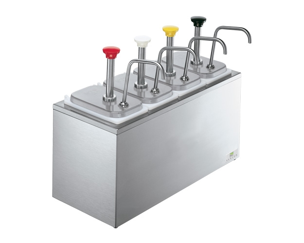 Keep your countertop clean and convenient with a serving bar. The SB-4 includes four stainless steel condiment pumps (83330) and four deep plastic fountain jars (82557). The stainless steel bar has a brushed finish to reduce the visibility of fingerprints. Insulated Serving Bars may be cooled with one Eutectic Ice Pack per jar, HOLDCOLD™ Jars or ice.